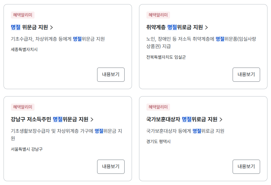 💸 명절지원금 신청 명절지원금을 신청하는 가장 간편한 방법은 정부24를 이용하는 방법입니다. 명절지원금 외에도 내가 받을 수 있는 혜택을 한 번에 볼 수 있기 때문에 활용도가 높습니다.정부24 접속 및 로그인명절지원금, 명절위로금, 명절위문금 등 검색온라인 신청 클릭 후 신청서 제출검색되지 않는 경우에는 자동 지급 대상자일 확률이 높습니다. 정확한 금액이 궁금하거나 온라인 신청이 어려우신 분들은 신분증을 지참해 거주지 관할 주민센터를 방문하시면 됩니다. 명절지원금 신청하기