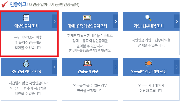 예상수령액은 위에서 언급했던 납부액 조회에서 간략하게 알 수 있지만 보다 자세한 내용은 예상연금액 조회 메뉴에서 확인하실 수 있습니다.