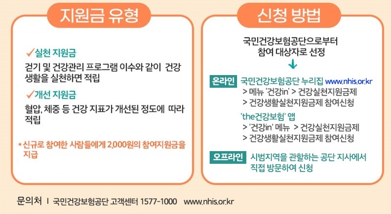 📌 건강생활지원금 신청 먼저 참여신청 바로가기를 통해 본인이 지원금을 신청할 수 있는 대상자인지 확인을 해야 합니다. 만약 본인이 참여 대상자라면 예방형, 관리형 중 어느 사업을 신청할 수 있는지 확인하실 수 있습니다.지원금 참여 신청은 온라인 or 오프라인을 통해 가능합니다. 온라인은 국민건강보험공단 홈페이지 혹은 The건강보험앱의 건강생활실천지원금제 참여신청 탭에서 신청.오프라인은 시범지역을 관할하는 공단 지사에 직접 방문하셔서 신청하실 수 있습니다.아래 건강보험홈페이지 바로가기를 통해 빠르게 이동 및 The건강보험앱을 다운로드 하실 수 있습니다. 건강보험홈페이지 바로가기 적립지급액 확인 지원금 해당 지역 확인