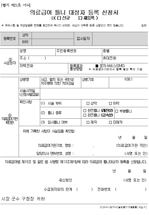 📌 임플란트지원금 구비서류 및 문의처 임플란트지원금은 전국 시군구청에 방문하여 신청하셔야 합니다. 또는 치과(의료기관)에서 전산등록 후 시군구청에서 승인하여 대상자 등록이 되어야 합니다.신청하실 때 의료급여 틀니 대상자 등록 신청서가 필요하며, 아래 버튼을 통해 간단하게 다운로드 받으실 수 있습니다.기타 다른 문의는 보건복지상담센터 및 129번 으로 전화 하시면 친절하게 답변을 드립니다.보건복지상담센터 바로가기▶ 서류 다운로드 지원대상자 확인 임플란트 급여 관련 Q&A