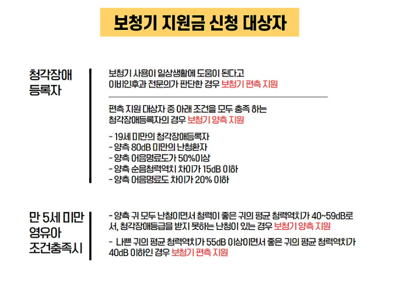 3. 만 5세 미만의 영유아(60개월)는 청각장애 등록이 되지 않았다고 하더라도, 보청기 보조금 지원 대상입니다.