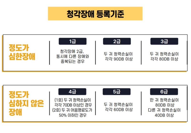 양측 지원 : 양 귀가 모두 난청이 있으며, 좋은 귀 평균 청력역치가 40-59 dB이며, 청각장애등급을 받지 못한 경우 편측 지원 : 나쁜 귀의 평균 청력역치가 55 dB 이상이며, 좋은 귀의 청력이 40 dB 이하인 경우