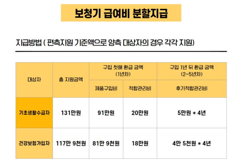 1) 기초생활수급자 (총 지원금 131만원), 구입 직후 111만원 환급, 사후관리비 20만원은 매년 5만원씩 4년에 걸쳐 환급 2) 건강보험가입자 (총 지원금 117만 9천원), 구입 직후 99만 9천원 환급, 사후 관리비 18만원은 매년 4만 5천원씩 4년에 걸쳐 환급