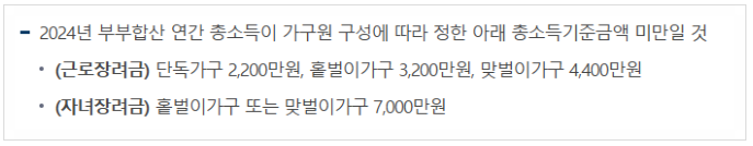 근로장려금 지급액 계산 근로장려금 수급 조건에 딱 부합한다면 가장 궁금한 건, ‘그래서 얼마나 받을 수 있는데?’일 텐데요. 근로장려금 금액은 신청자의 가구 유형과 소득, 재산 금액 등에 따라 다르게 산정돼요. 우선, 가구 유형에 따른 근로장려금 최대 지급 가능액은 다음과 같아요.예를 들면 단독가구 기준 총 소득 기준 금액 2,200만 원 미만 구간이더라도 급여 수준에 따라 근로장려금은 차등 지급 됩니다. 조금 복잡하지만, 구체적인 지원 금액을 알고 싶다면 아래 계산식을 활용해 보시기 바랍니다.[단독가구] 총 급여액 등 400만 원 미만: 총 급여액 등 X 400분의 165 총 급여액 등 400만 원~900만 원 미만: 165만 원 정액 총 급여액 등 900만 원~2,200만 원 미만: 165만 원 – (총 급여액 등 – 900만 원) X 1,100분의 165[홑벌이 가구] 총 급여액 등 700만 원 미만: 총 급여액 등 X 700분의 285 총 급여액 등 700만 원~1,400만 원 미만: 285만 원 정액 총 급여액 등 1,400만 원~3,200만 원 미만: 285만 원 – (총 급여액 등 – 1,400만 원) X 1,600분의 285[맞벌이 가구]총 급여액 등 800만 원 미만: 총 급여액 등 X 800분의 330 총 급여액 등 800만 원~1,700만 원 미만: 330만 원 정액 총 급여액 등 1,700만 원~4,400만 원 미만: 330만 원 – (총 급여액 등 – 1,700만 원) X 1,900분의 330 계산이 어려우신 분이나 조금이나마 정확하게 금액을 확인하시려면 국세청 홈택스 홈페이지에서 모의 계산을 통해 지급액을 계산해보실 수 있습니다. 아래 바로가기 버튼을 통해 빠르게 확인해보세요!! 홈택스 바로가기 장려금 모바일앱 다운로드