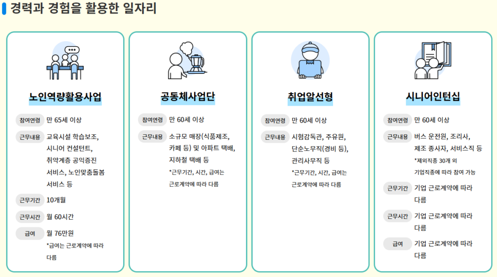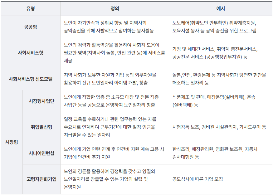 📌 노인일자리 유형 및 대상 공공형 : 만 65세 이상 기초연금 수급자사회서비스형 : 만 65세 이상 사업 참여 가능자* 사회서비스형은 일부 유형 만 60세 이상 사업참여 가능시장형 : 만 60세 이상 사업 참여 가능자 노인일자리 신청