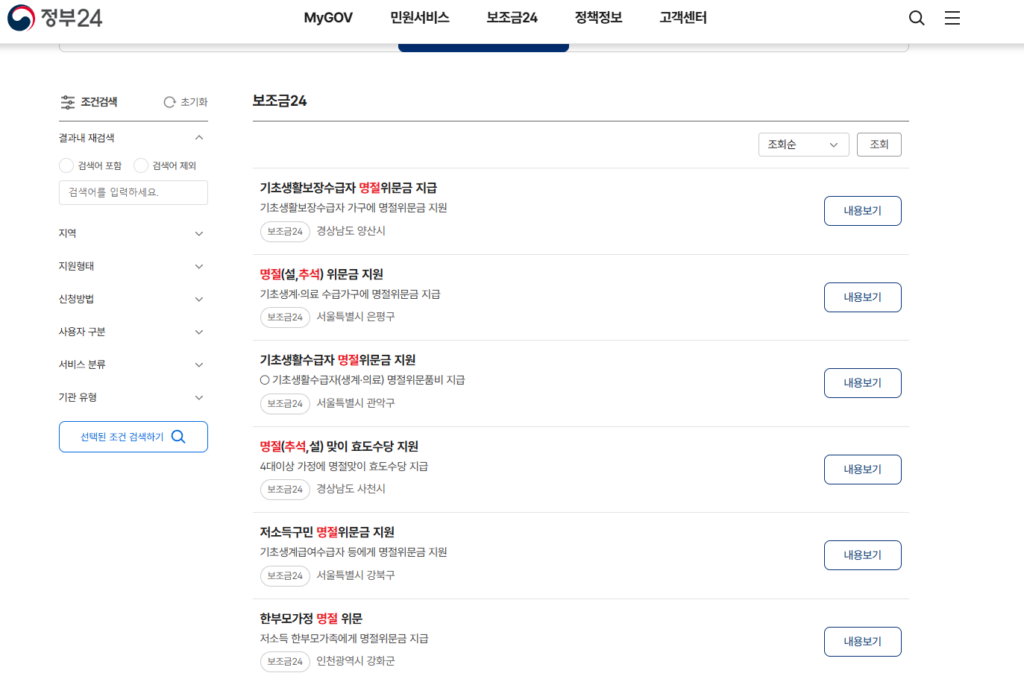 📌 명절지원금 신청방법 명절지원금을 신청하는 방법은 두 가지가 있습니다.온라인 : 정부24 사이트(www.gov.kr)에서 신청사이트에 접속한 뒤 검색창에 키워드(지역명+명절 지원)를 입력 -> 페이지 이동 후 본인 인증을 완료 및 서류를 작성하고 제출– 검색키워드 예시 : 명절위로금, 명절지원금, 명절위문금, 명절격려금 등오프라인 : 주민센터 직접 방문해서 신청방문할 때는 주민등록증 같은 신분증 등, 필수서류가 필요합니다. 보통 수급자 증명서나 차상위 계층 확인서가 필요합니다. 정부24 바로가기 명절지원금은 보통 아래와 같은 대상에게 지급 됩니다.기초생활보장수급자: 생계·의료·주거급여를 받는 가구차상위계층: 소득이 일정 기준 이하인 가구한부모가정: 법적 보호 대상에 해당하는 한부모 가정65세 이상 독거노인: 경제적 도움이 필요한 고령층국가보훈대상자: 국가유공자 및 해당 가족 혹시 해당사항이 없으시다면 아래 못 받은 환급금을 확인해 보시길 바랍니다.환급금의 경우 모든 사람이 대상자이고 혹시 몰라서 신청 못하신 분들이 많이 있기 때문에 알아보시고 꼭 신청하셔서 받아가시길 바랍니다. 못받은 환급금 확인