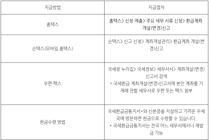 📌 국세환급금 신청 국세환급을 신청하여 환급받을 금액이 발생하게 되면 계좌로 지급을 받을 수 있습니다.우체국에 방문하여 수령도 가능합니다.아래의 방법 중 편한 방법을 이용하시면 됩니다! 국세환급금 신청하기 모바일앱 다운로드