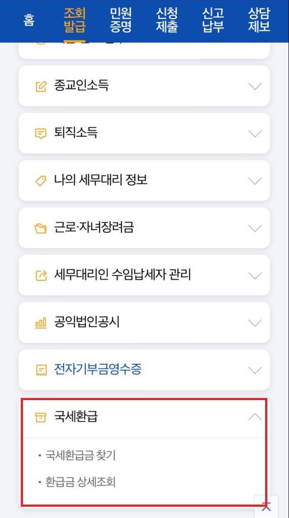 📌 국세환급금 조회 국세환급금은 아래 방법을 통해 쉽게 조회해보실 수 있습니다.PC를 이용한 조회 방법홈택스 홈페이지 접속환급금조회 선택조회/발급 -> 기타조회/발급 -> 국세환급금 찾기주민등록번호 또는 사업자등록번호 입력 및 성명 입력조회하기 선택환급금 조회 결과 확인휴대폰을 이용한 조회 방법손택스(홈택스 모바일앱) 설치인증서로 로그인환급금 조회 선택환급금 조회결과 확인 국세환급금 신청하기 모바일앱 다운로드